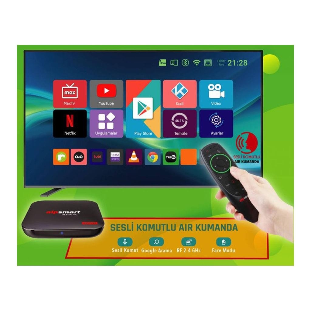 Sesli komut ve air mouse özellikli kumandası, android 12 sürümü ve yeni nesil işlemcisi ile Alpsmart AS-514 Stoklarımızlda.