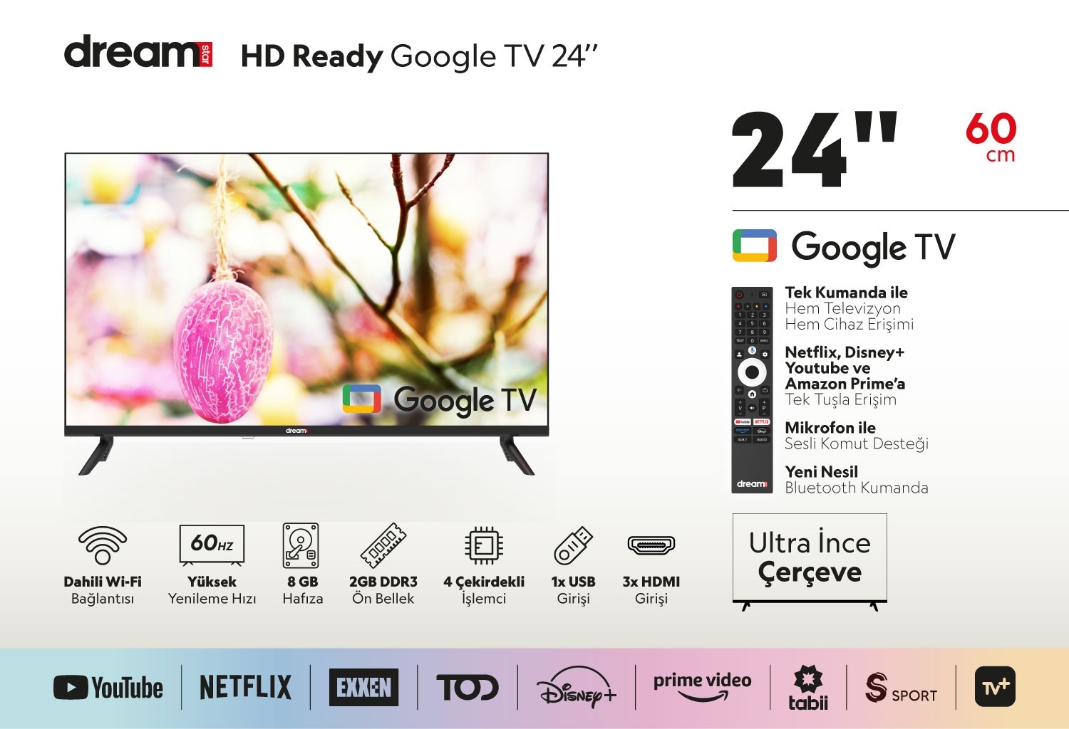 DREAMSTAR 24" HD Frameless Google TV ile kompakt boyutta akıllı ve pratik bir izleme deneyimi yaşayın!