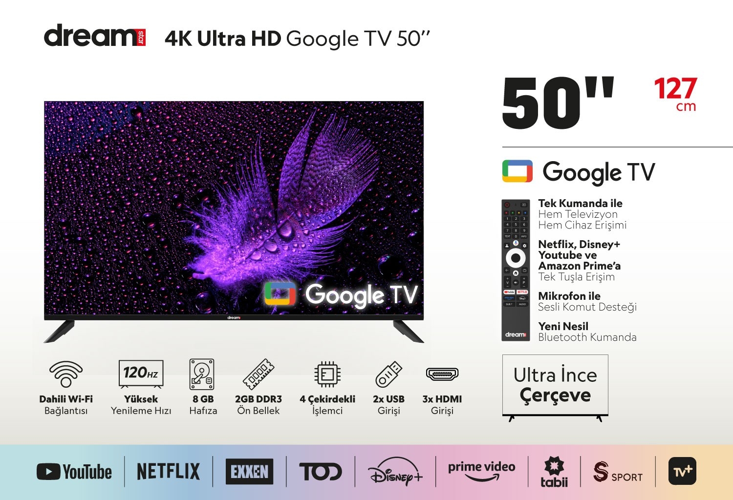 DREAMSTAR 50'' (127 cm) 4K (UHD) Frameless Google TV – Şık Tasarım, Mükemmel Performans