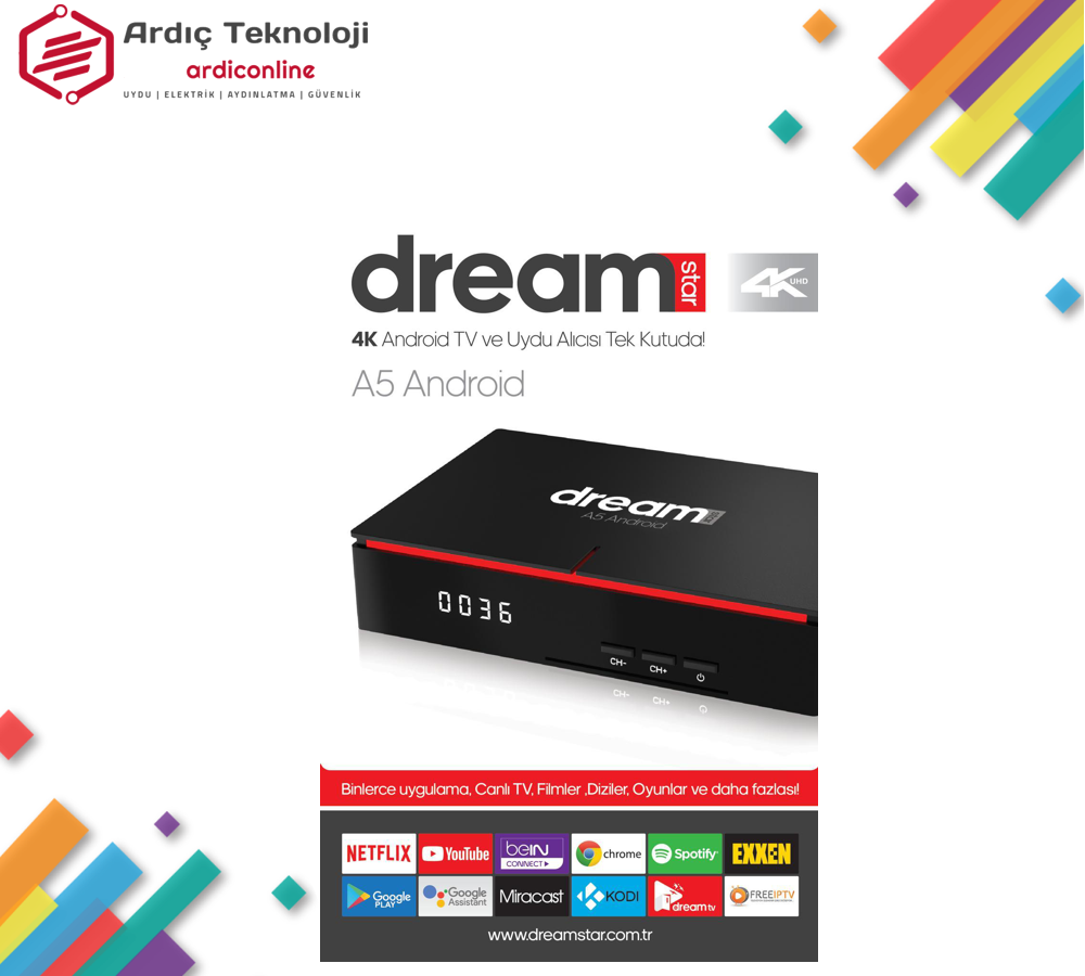 Dreamstar kalitesine en çok android teknolojisi yakışıyor. Mükemmel derecede stabil yazılım, cihaza özel ip uygulamaları, yüksek görüntü kalitesi. Bu teknolojiye hayran kalacaksınız.