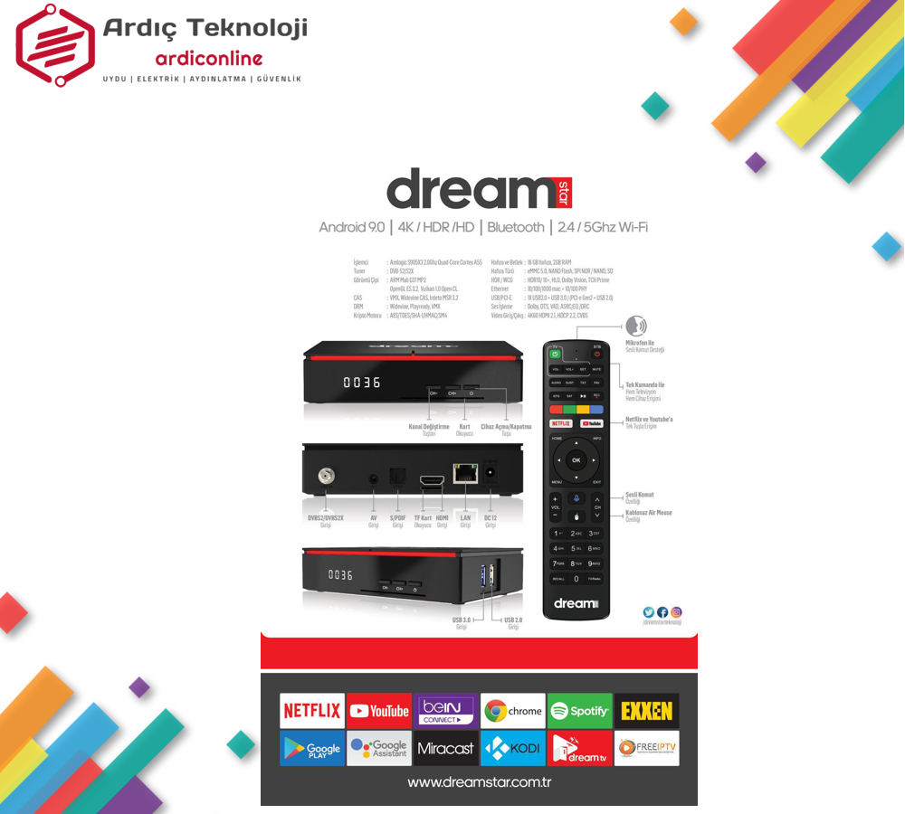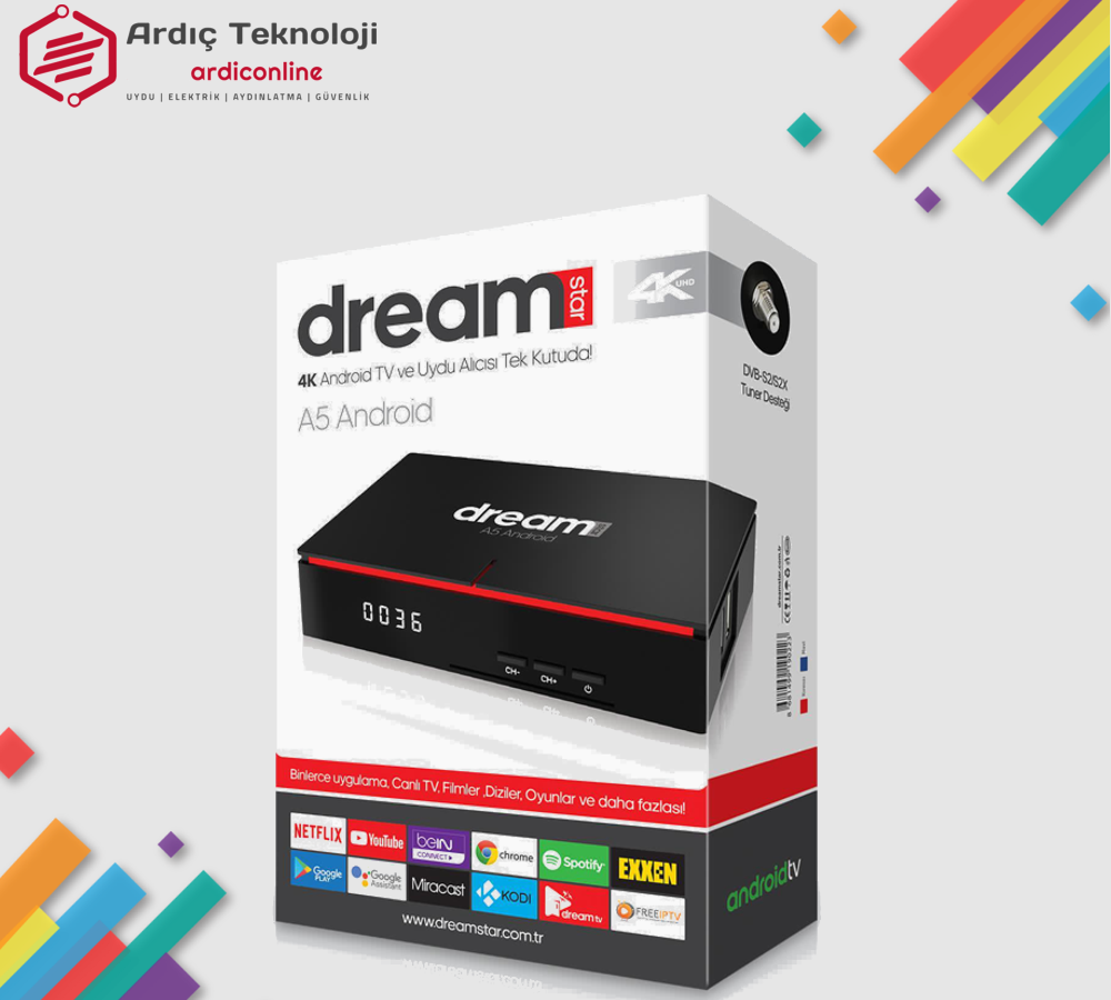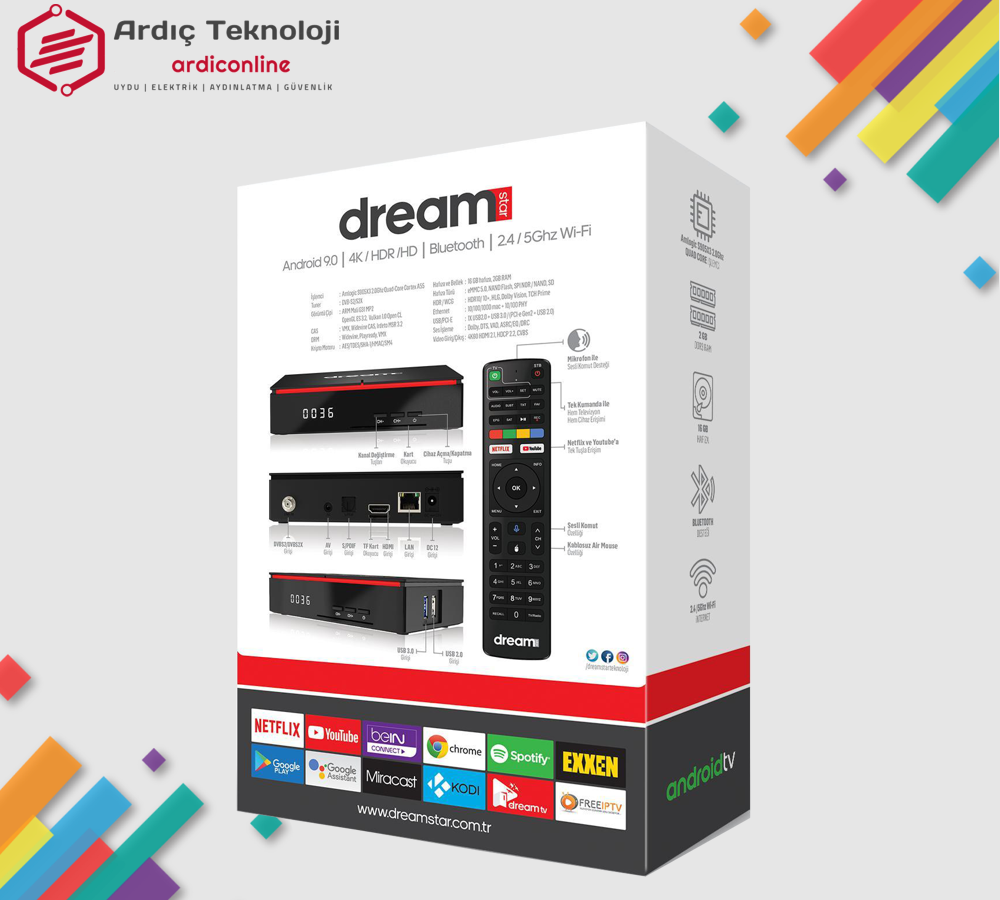Dreamstar kalitesine en çok android teknolojisi yakışıyor. Mükemmel derecede stabil yazılım, cihaza özel ip uygulamaları, yüksek görüntü kalitesi. Bu teknolojiye hayran kalacaksınız.
