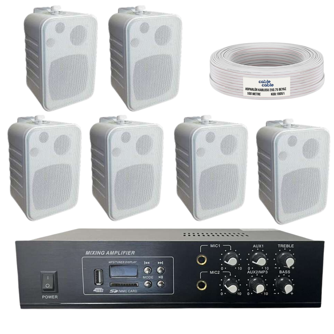Seslendirme Paketi 3-DW SESLENDİRME PAKETİ ÖZELLİKLERİ (6 BEYAZ DUVAR TİPİ HOPARLÖR) 6 Adet 20 Watt Duvar Tipi Hoparlör (Beyaz) 4” (10 cm) çapında 20 Watt hoparlör gücü 0-8 Ohm / 100V (Üçlü Klemens) Tweeter: 0.5” (13 mm) Mylar Dome 89dB hassasiyet 70Hz – 20kHz frekans aralığı Şık ve dayanıklı beyaz tasarım 1 Adet Hat Trafolu Mikser Amfi (80 Watt) 4-16 Ohm çıkış empedansı / 75V-120V MP3 Player (USB/SD Kart Girişi) Bluetooth bağlantı desteği 2 mikrofon girişi AUX IN, DVD IN, MIX OUT bağlantıları 220V AC güç beslemesi 1 Adet 100 Metre Kordon Kablo (2x0,75 mm²) Dayanıklı ve yüksek iletkenlik sağlayan bakır kablo Profesyonel ses aktarımı için ideal Estetik ve güçlü ses çözümü! Ofisler, mağazalar, restoranlar ve işletmeler için ideal!