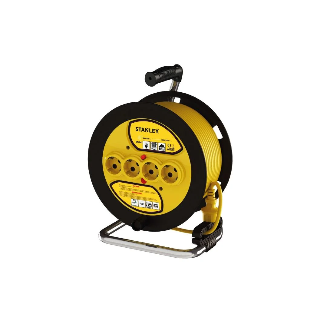 Stanley 40 metre makaralı uzatma kablosu, 3x1,5mm² bakır kablo, 4 priz, 16A kapasite, termal sigorta ve güç göstergesi ile uzun mesafede güvenli elektrik kullanımı sunar.
