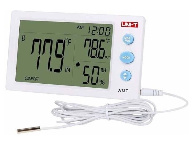 A12T, gerçek zamanlı sıcaklık ve nemi ölçer ve okumaları büyük bir ekranda görüntüler. Hem iç hem de dış mekan için kullanılabilir. A12T, iki konumun sıcaklıklarını ölçmek için harici bir sensör probuna sahiptir. Sayacın çalar saati ve 12/24 zaman modu vardır ve sıcaklık ve nem kombinasyonuna dayalı konfor derecesini gösterir. Duvara veya masaya montaj için asma deliği ve tripod mevcuttur.