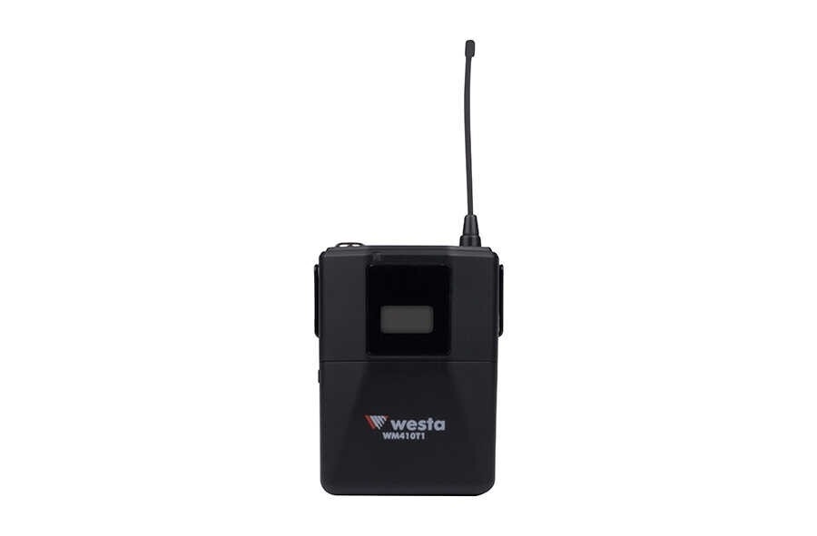 Westa WM-410T1, DM-410R alıcı ile uyumlu çalışan, profesyonel ses iletimi sağlayan UHF kablosuz yaka mikrofonudur. Güçlü sinyal iletimi, hafif ve ergonomik tasarımı ile sahne performansları, eğitimler, konferanslar, sunumlar ve yayınlar için ideal bir çözümdür.