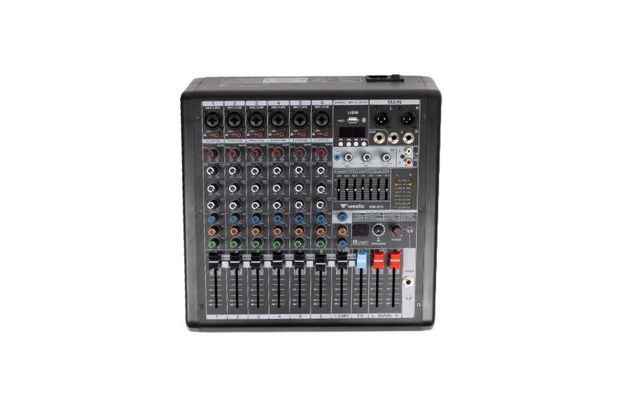 Westa WM-8FX 8 Kanal Deck Mixer USB, Bluetooth, Ekolu 8 Mono Mic / Line giriş, 2 Aux, 1 Return, 3 band EQ, 48V Phantom, Kulaklık Çıkışı, 7 Bant Grafik Ekolayzer Kulaklık Çıkışı, Kontrol Odası Çıkışı (Mix Operatör), 99 DSP Dijital Efekt, Güç: 100-240V - 50/60Hz Mic / Line İnput: 8 X Combo XLR Main Out: 2 X XLR Dişi