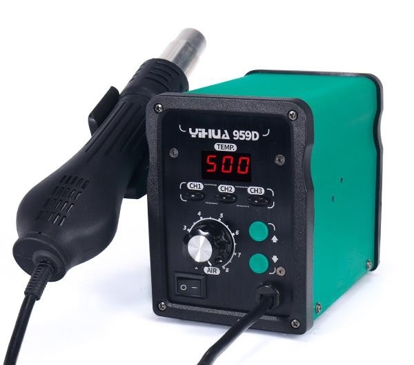 YIHUA-959D sıcak hava istasyonu laboratuvarlar, okullar, elektronik üretim hatları, cep telefonu tamir endüstrisi ve ev aletleri bakım departmanı gibi birçok alanda yaygın olarak bulunur. SMD bileşenleri, çok pinli IC ve devre kartı bileşenlerini lehimlemek için kullanabilirsiniz.