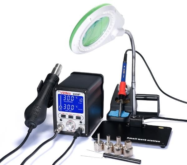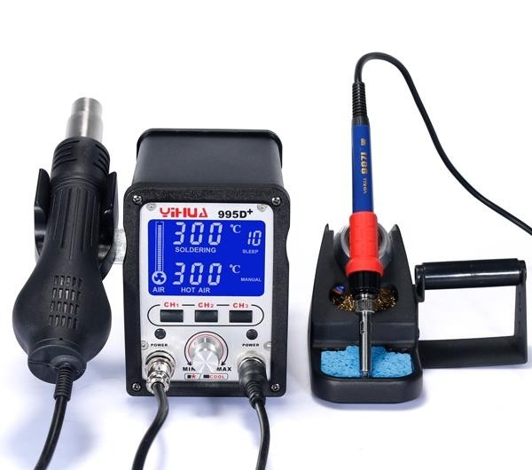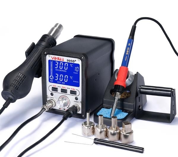 Yihua 995D+ Sıcak Hava İstasyonu Sıcak hava istasyonu ve lehimleme havyasının bir arada olduğu bir ünitedir. Sıcak hava ünitesi 500W, lehimleme havyası 75W gücünde olup geniş bir LCD ekrana sahiptir.